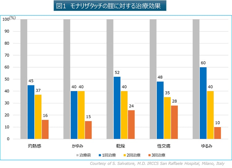 腟の症状に対する治療効果は図1の通りです。灼熱感(ヒリヒリする感じ)は1回治療後に45%に、3回治療後に16%に減少しています。かゆみ・乾燥・性交痛・ゆるみも著明に改善しています。